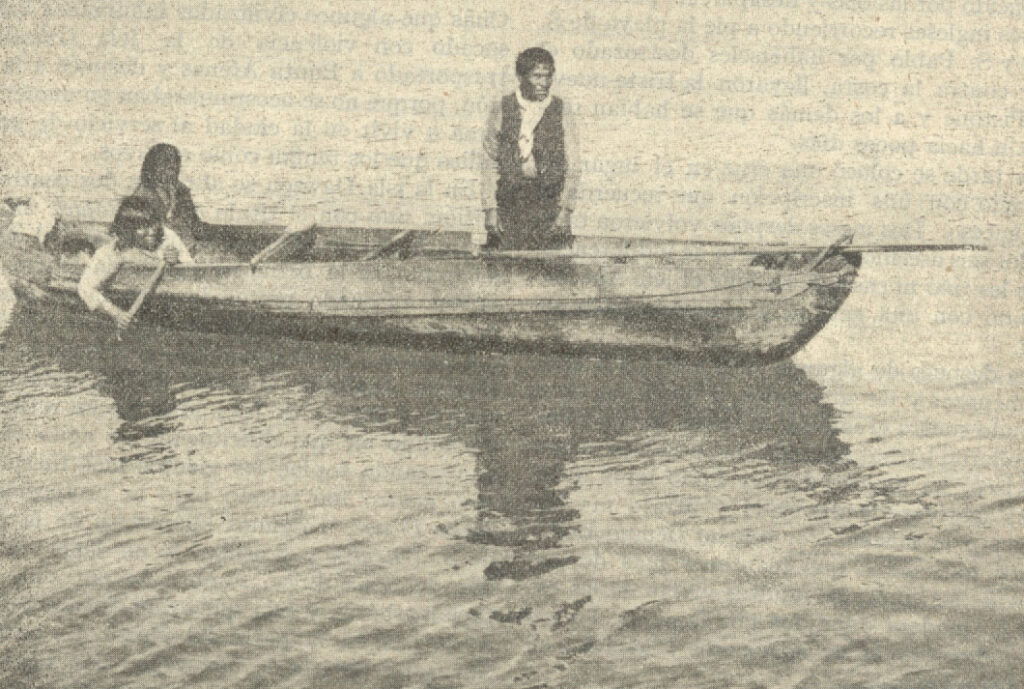 Los antiguos fueguinos canoeros, observados por el fotógrafo del siglo XX. Han cambiado sus indumentarias, su canoa es de tronco ahuecado con algunos elementos transversales producto de lo que han aprendido del marinero europeo. Son más bien alakalufes que yamanas, aunque tal vez sean ya mestizos de todo lo que viene cambiando, construyendo y destruyendo a la vez.