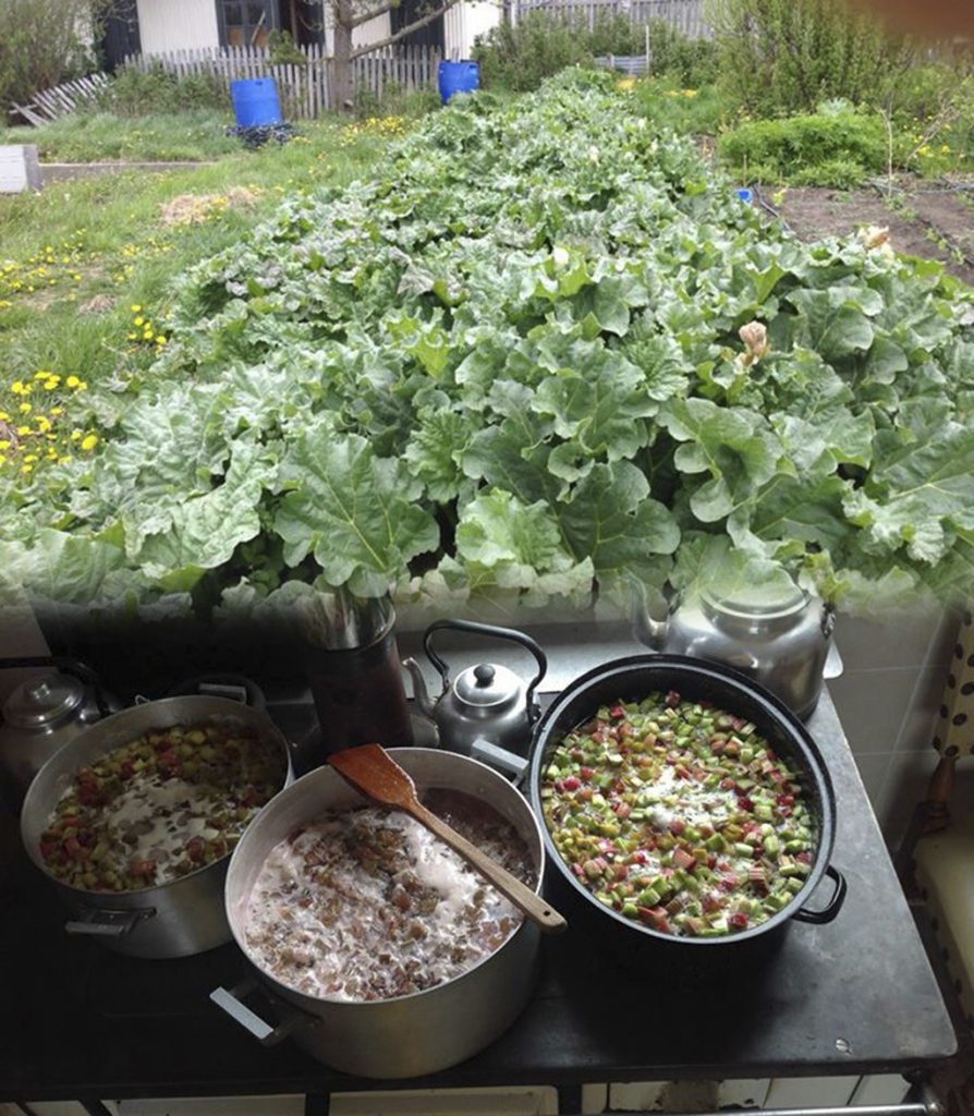 El ruibarbo, en dos planos de su existencia: el de la abundancia creciendo como planta ornamental; el de su transformación camino a la mermelada en cocina de hierro.