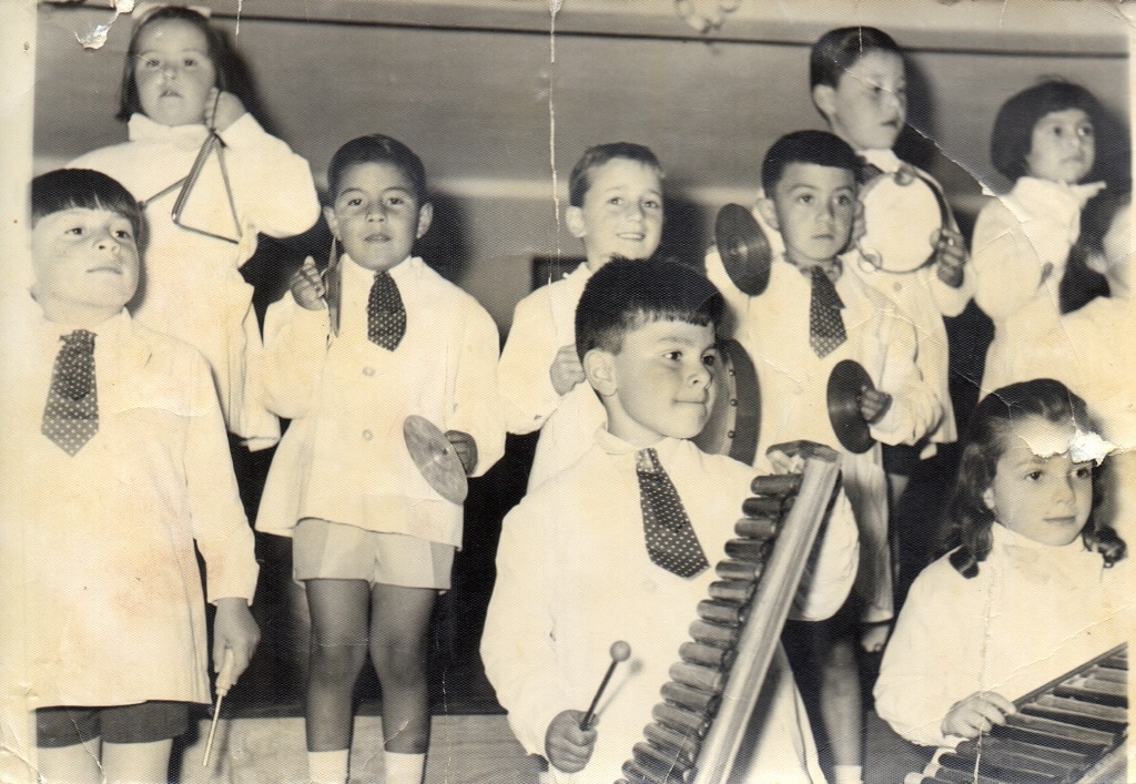 Jardín de Infantes del María Auxiliadora de Río Grande. Por los años 60. En esta orquesta tocan: Graciela Vukasovic, Oscar Mingorance, José Antonio Guenchur y José Moisés Pérez. Debajo de Graciela, una chica de apellido Rubio y cerca de ella María Canga. Entre otros…