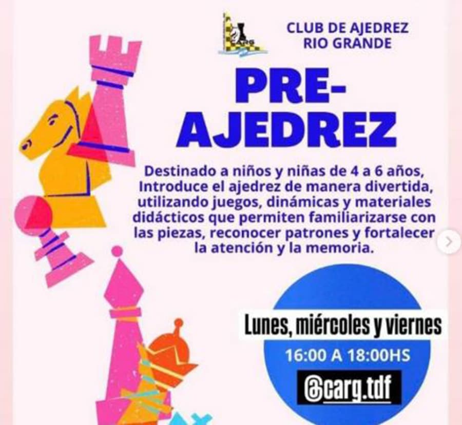Finalmente, los martes y jueves, de 19:00 a 21:00, Leonel Yanacón (2964-693362) destinará sus enseñanzas para quienes busquen seguir aprendiendo y perfeccionando sus conocimientos (Ajedrez para todos los Niveles).
