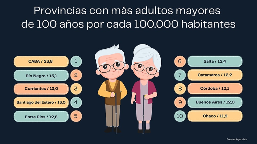 A nivel provincial, la Ciudad Autónoma de Buenos Aires encabeza la lista de jurisdicciones con mayor proporción de personas centenarias en Argentina, con 23,8 por cada 100.000 habitantes. En segundo lugar se ubica Río Negro, que registra 15,1, seguida por Corrientes con 13,0. Más abajo aparecen Santiago del Estero, también con 13,0, y Entre Ríos, que alcanza 12,8.