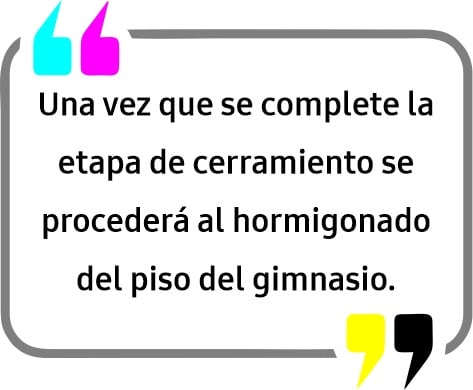 Una vez que se complete la etapa de cerramiento, el personal técnico y operario procederá al hormigonado del piso del gimnasio. Esta instancia es crucial, ya que permitirá continuar con las terminaciones interiores y avanzar hacia las fases posteriores de equipamiento del espacio deportivo.