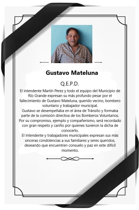 El intendente Martín Perez y todo el equipo del Municipio de Río Grande expresan su más profundo pesar por el fallecimiento de Gustavo Mateluna, querido vecino, bombero voluntario y trabajador municipal.