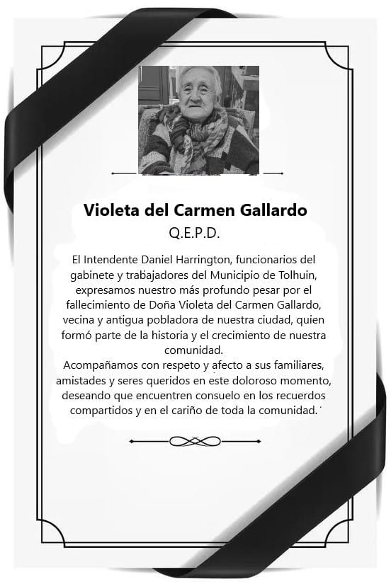 El Intendente Daniel Harrington, funcionarios del gabinete y trabajadores del Municipio de Tolhuin, expresamos nuestro más profundo pesar por el fallecimiento de Doña Violeta del Carmen Gallardo, vecina y antigua pobladora de nuestra ciudad, quien formó parte de la historia y el crecimiento de nuestra comunidad.