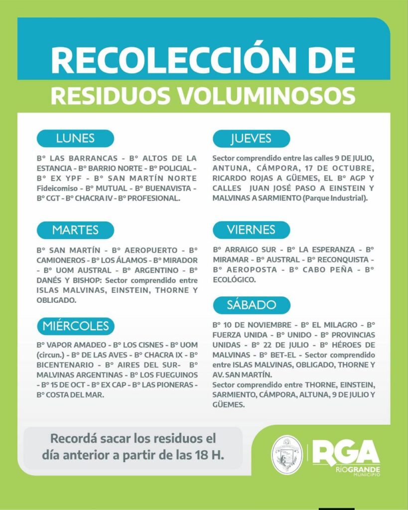 El Municipio recuerda la vigencia de la ordenanza 2941/11 la cual prohíbe arrojar residuos en lugares no habilitados como espacios públicos y bulevares. Se solicita respetar los días de recolección de residuos voluminosos estipulados para cada barrio a fin de lograr una ciudad más limpia y ordenada.