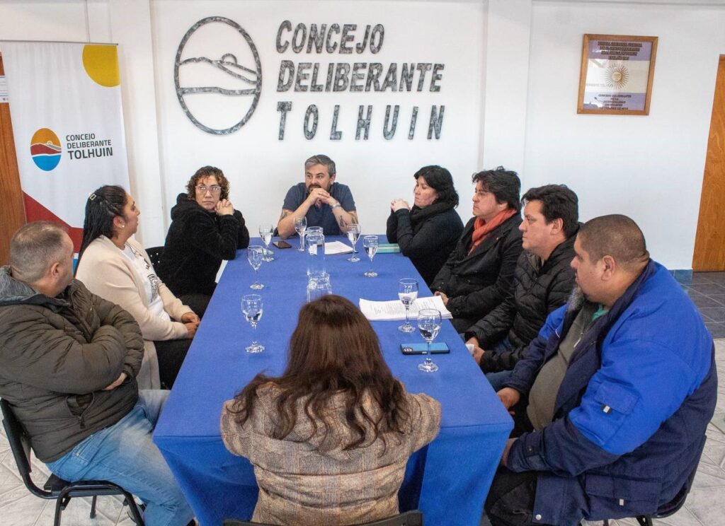 TOLHUIN.-Del encuentro y en representación del Concejo Deliberante participaron el presidente Matías Rodríguez Ojeda, la vicepresidenta 1° Jeannette Alderete, la vicepresidenta 2° Rosana del Valle Taberna y el concejal Marcelo Muñoz Fernández, mientras que por C.O.E.M.A se hizo presente el delegado Hugo Gonzalez, la delegada Nadia Barría y los afiliados Facundo Carrizo, Mirta Vera y Julio Acosta.