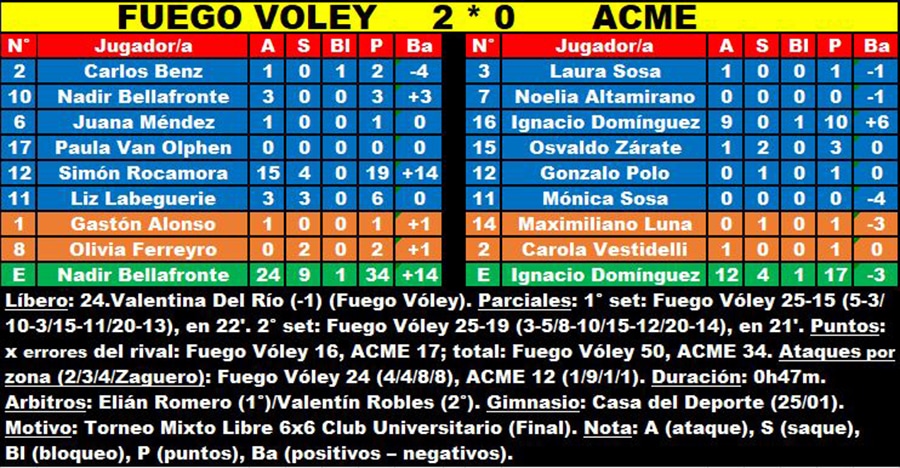 El podio se completó con Fuego Vóley, al superar en sets corridos a Acme (el único conjunto integrado en su totalidad por jugadores mayores), con parciales de 25-15 y 25-19. Simón Rocamora fue decisivo en el ganado, con 19 tantos (+14), mientras que Ignacio Domínguez se destacó en el rival, con 10 (+6).