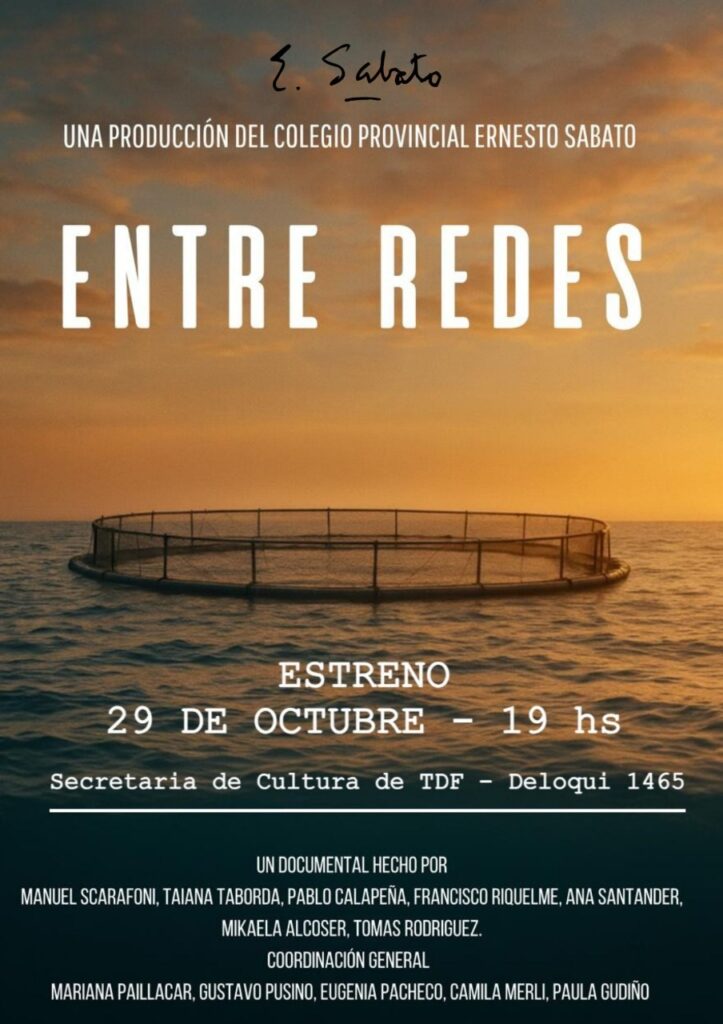 USHUAIA.- Una nueva generación de fueguinos se anima a mirar de frente el futuro. Este miércoles 29 de octubre a las 19 horas, en la sede de la Secretaría de Cultura de Tierra del Fuego —ubicada en Deloqui 1465, Ushuaia— se proyectará “Entre Redes”, un documental íntegramente producido por estudiantes de 7° año del Colegio Técnico Ernesto Sabato. La obra indaga en profundidad sobre el impacto potencial de la instalación de salmoneras en la provincia, con una mirada crítica, plural y profundamente comprometida con el territorio.