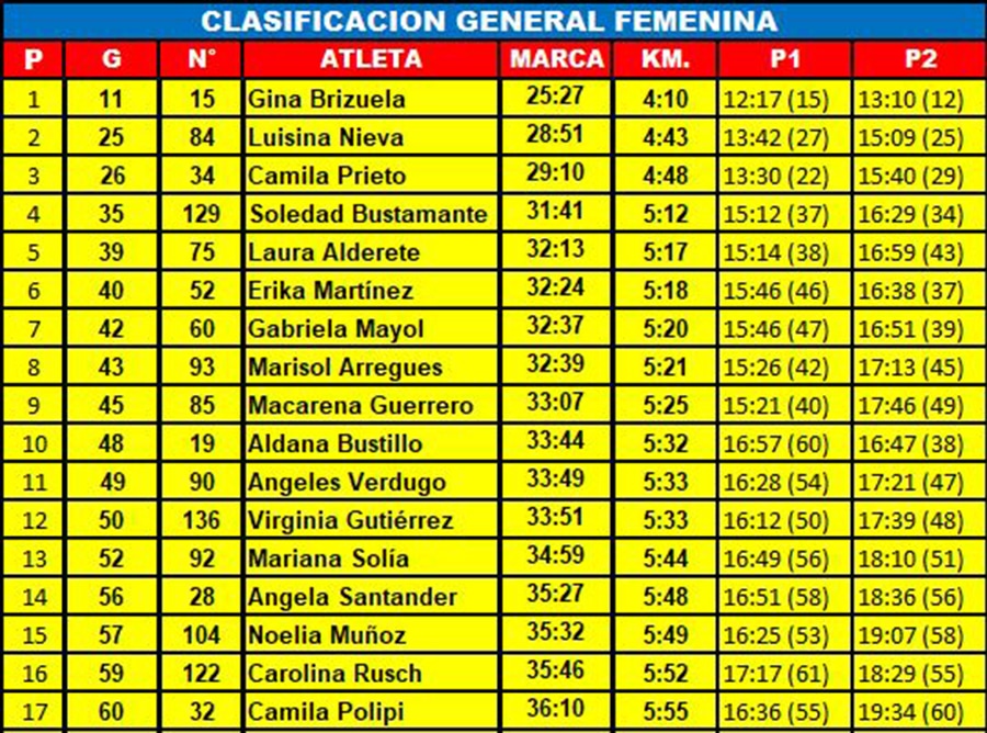 Por su parte, Brizuela se ubicó undécima en la general absoluta, sobre un total de 81 clasificados. Cronometró 25:27, a 4:10 de media, y a 14,381 km/h. El podio en la rama femenina se completó con Luisina Nieva -28:51- y Camila Prieto -29:10-.