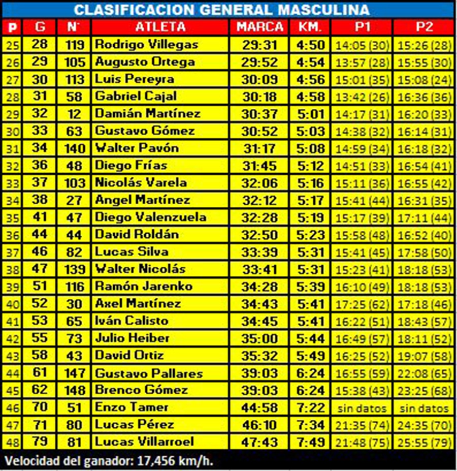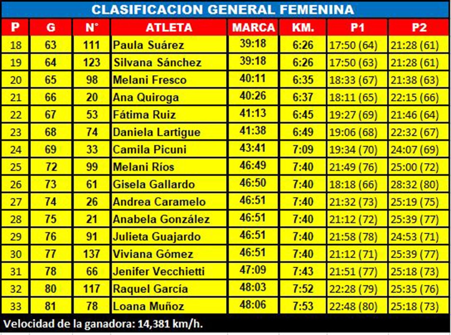 En los cuadros adjuntos aparece la clasificación general en cada rama, y la absoluta, con la marca, el promedio por kilómetro, y los dos parciales (km. 0-3 y 3-6,1).