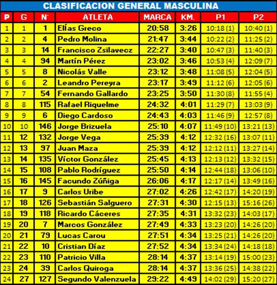 RIO GRANDE.- Greco registró 20 minutos y 58 segundos (20:58) para cubrir la distancia, anticipándose por amplio margen a Pedro Molina (Kratos) -21:47- y Francisco Szilavecz (La Voz del Viento) -22:27-. El vencedor corrió a razón de 3:26 por kilómetro, y a una velocidad de 17,456 km/h.