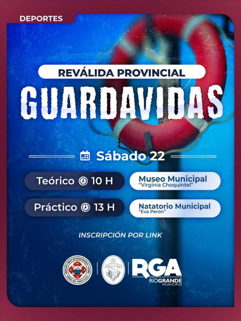 El Municipio de Río Grande, a través de la Subsecretaría de Deportes, informa que ya se encuentran abiertas las inscripciones para ser parte de la Reválida Provincial de Guardavidas, instancia obligatoria para mantener vigente la certificación profesional en la provincia.