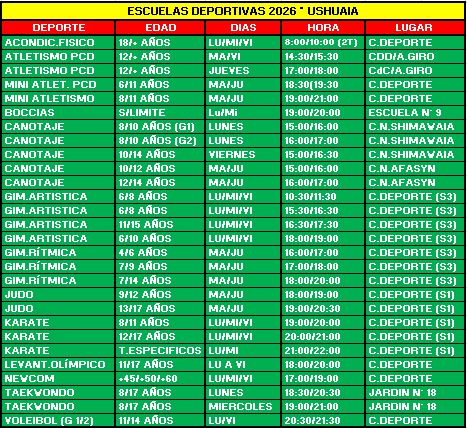 La información detallada sobre disciplinas, edades, horarios y sedes se encuentra disponible en https://www.tierradelfuego.gob.ar/actividades-deportivas.
