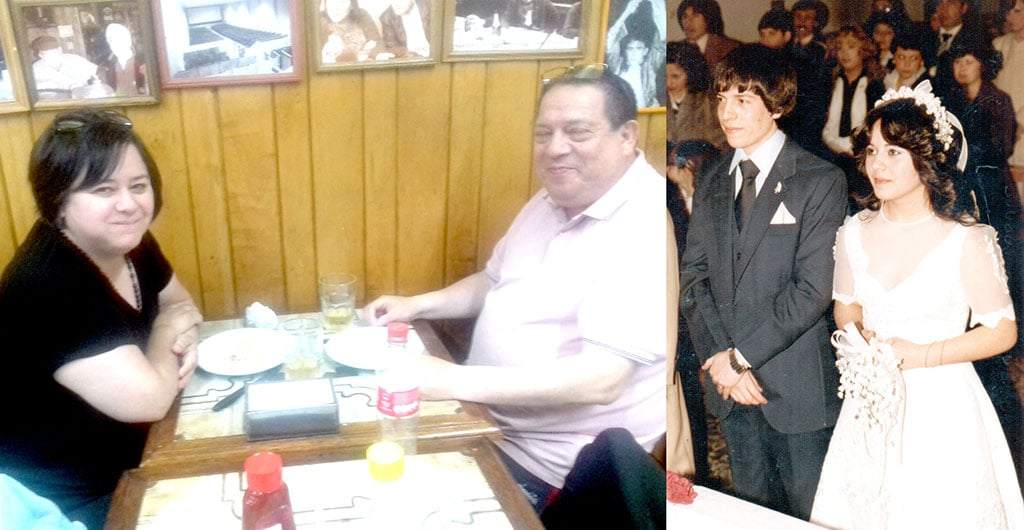 Jorge Antonio Martinovic y Cecilia Saldivia, en dos momentos de su vida, el fundacional: 11º de septiembre de 1982, al casarse, y una salida cotidiana en tiempos recientes.