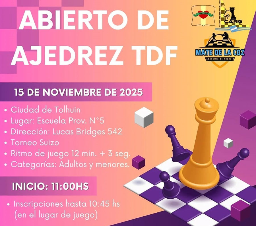 “Tanto aficionados como jugadores federados tendrán la posibilidad de jugar con el Gran Maestro, de tomar la clase y además sacarse fotos o hacer firmar ejemplares de sus libros. La actividad comenzará a las 17:00, y el lugar está aún a confirmar”, detalló Torres, quien agradeció el apoyo del CARG, Accesorios Rivadavia, Panadería La Fueguina, Autosur SA y el concejal Federico Runín.