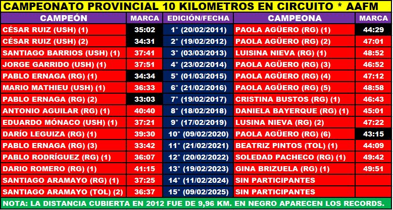 Entretanto, el domingo 1° de febrero (concentración, 9:30; largada, 10:00, en Vivaldi y Dalí, de Altos de la Estancia) se disputará el 16° Campeonato Provincial de 10 Kilómetros, organizado por la Agrupación Atlética Fin del Mundo. Inscripción: $20.000. Informes: