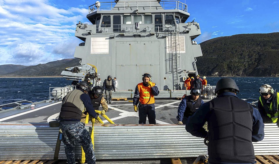 El patrullero oceánico ARA “Piedrabuena” transportó personal y materiales para la puesta en valor de la instalación.