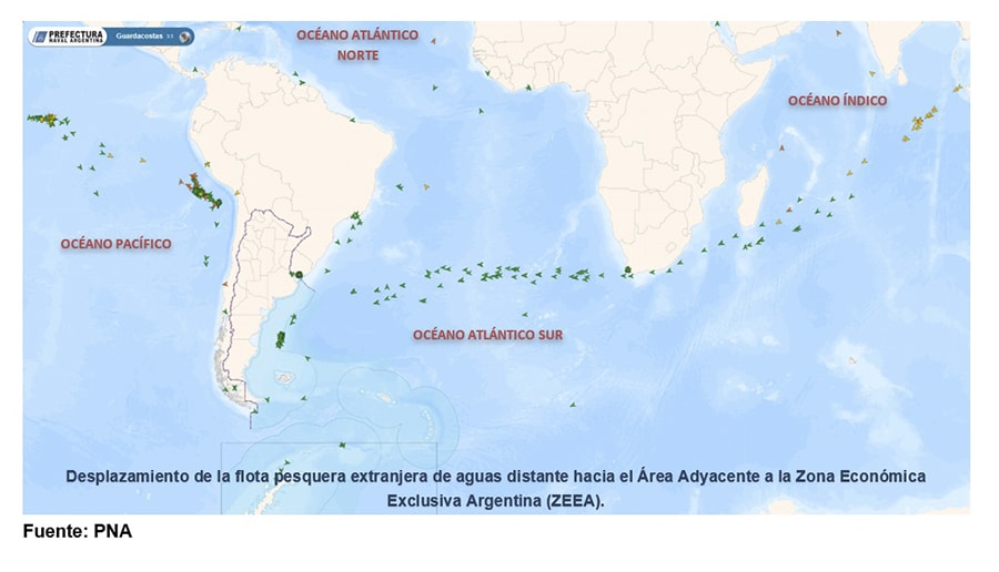 Cabe resaltar que entre noviembre y junio, grandes flotas navegan desde variados puntos del mundo hacia el área adyacente a la ZEEA para desarrollar actividades de pesca.