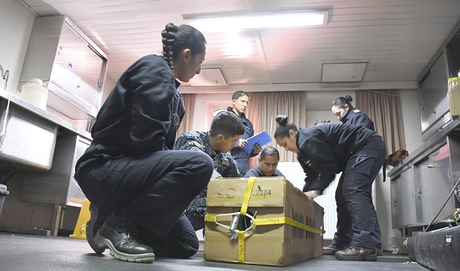 El Suboficial Segundo Ramón Miño, encargado de la Central Meteorológica a bordo, explicó que “una vez lanzada la boya se va sumergiendo hasta los 2.000 mt al tiempo que va recopilando y registrando datos como temperatura y salinidad del agua a distintas profundidades, que son remitidos por satélite. Luego de diez días, el artefacto emerge y permanece a la deriva sobre las corrientes oceánicas, brindando información periódica”.