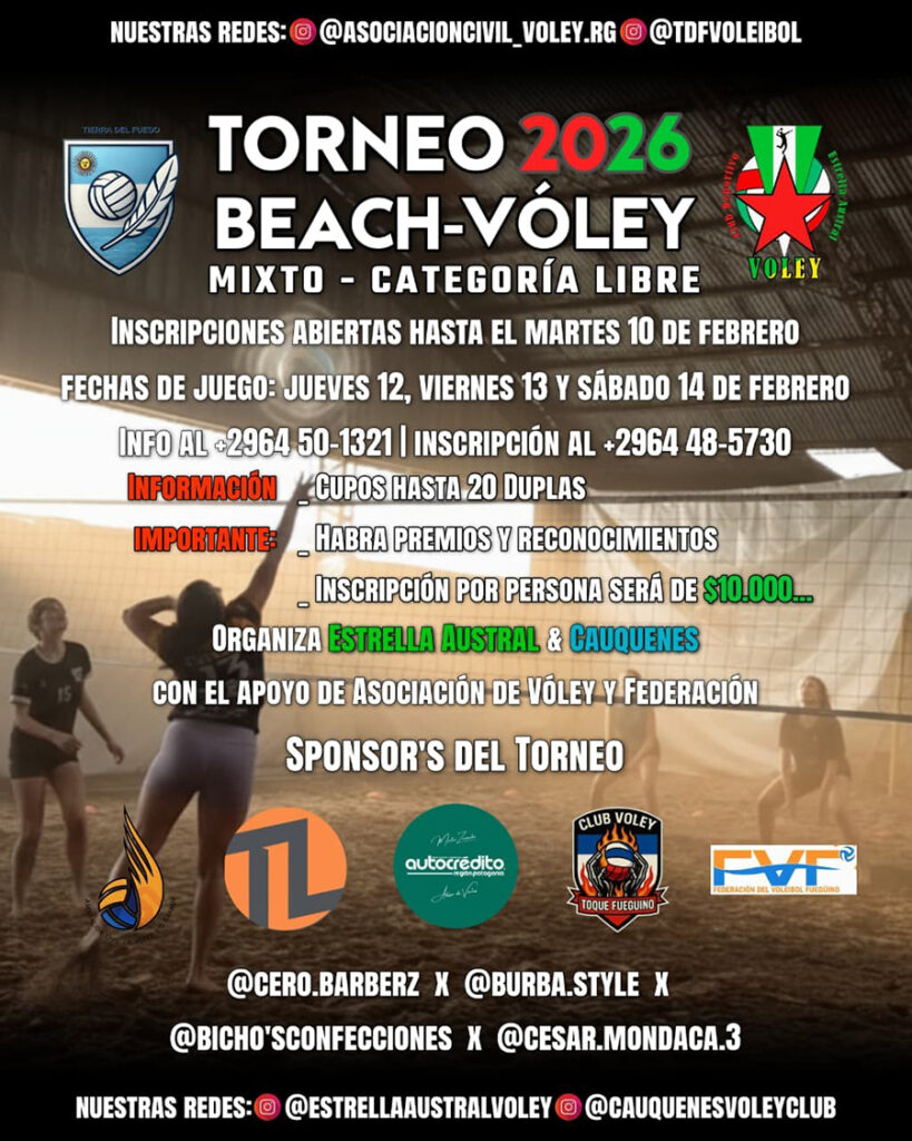 Por último, hasta el martes 10 estarán abiertas las inscripciones para el torneo de voleibol playa (duplas mixtas, categoría libre), que organizan Estrella Austral y Cauquenes, con el apoyo de la Asociación de Vóley Río Grande (AVRG) y de la Federación del Voleibol Fueguino (FVF).