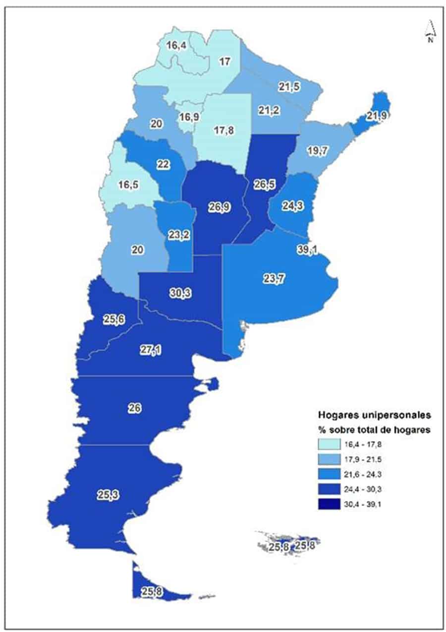 BUENOS AIRES.- Este tipo de hogares son muy importantes en CABA, donde alcanzan a 39,1% y al 17,9% de las personas. También es alta la participación de hogares unipersonales en las provincias pampeanas (Entre 26 y 30% en La Pampa, Córdoba, Santa Fe) y patagónicas (Entre 25 y 27% en Río Negro, Neuquén, Chubut, Santa Cruz y Tierra del Fuego). Por su parte, representan menos de 20% de los hogares urbanos en las provincias de San Juan, Tucumán, Salta, Santiago del Estero, Corrientes y Catamarca. En estas provincias hay más hogares numerosos (más de 5 miembros) que unipersonales.