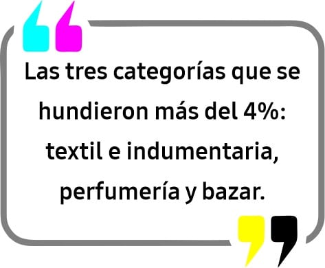 En la comparación mes contra mes, tres categorías se hundieron más del 4%: textil e indumentaria, perfumería y bazar. La baja en indumentaria, de 4,3% frente a julio, vuelve a poner en evidencia la debilidad de un sector que depende estrechamente del poder adquisitivo.