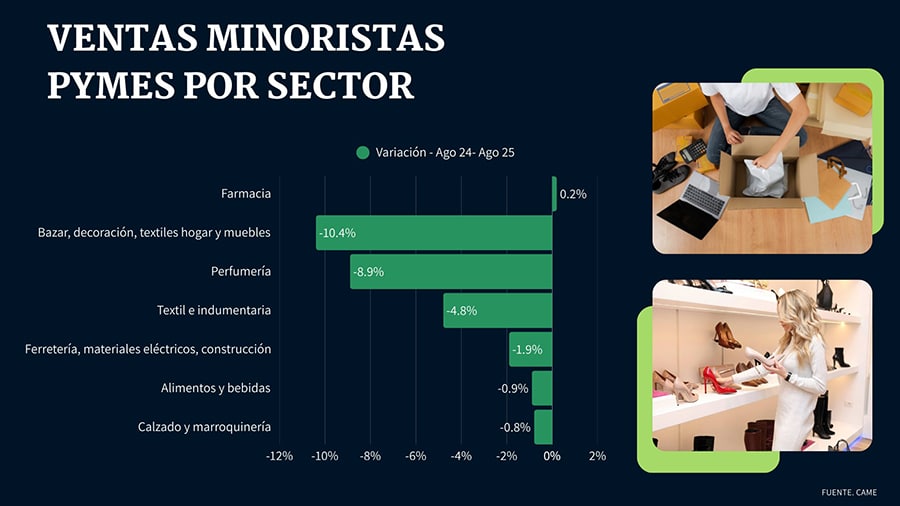 En el análisis por sectores, la situación fue dispar, aunque mayoritariamente negativa. Farmacia fue el único rubro que logró un resultado levemente positivo, con un alza del 0,2% interanual. El resto mostró retrocesos: bazar, decoración, textiles para el hogar y muebles se desplomó 10,4%; perfumería retrocedió 8,9%; textil e indumentaria bajó 4,8%; ferretería, materiales eléctricos y construcción cedió 1,9%; alimentos y bebidas retrocedió 0,9%; y calzado y marroquinería cayó 0,8%.