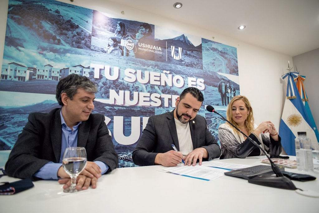 USHUAIA.- El intendente Walter Vuoto procedió a la firma de un convenio marco con la ministra de Desarrollo Territorial y Hábitat de la Nación, María Eugenia Bielsa, para la adhesión de la Municipalidad al Programa Nacional de Suelo Urbano, lo que permitirá realizar diferentes obras.